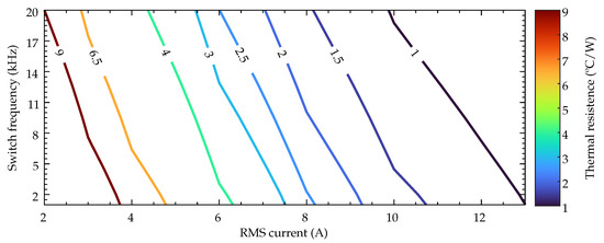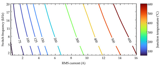 Based on the results presented in Figure 7, a heat sink with dimensions of 56 × 30 × 20 mm and a thermal resistance of 5.33 °C/W was selected. Subsequent simulations were conducted to observe the junction temperature in the steady state as a function of output current and switching frequency, considering the chosen heat sink. The results are illustrated in Figure 8. It should be noted that using a fan in conjunction with the heat sink can reduce the equivalent thermal resistance and enhance thermal exchange with the environment, thereby allowing for a higher output current. However, increasing the switching frequency reduces the maximum current that the converter can sustain.