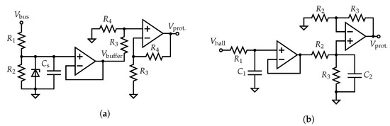 Schematic of a voltage and current signal conditioner circuit to measure the DC bus voltage and the main and auxiliary winding currents. (a) Voltage conditioner. (b) Current conditioner.