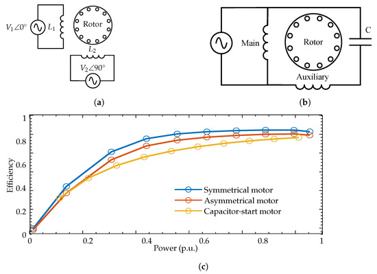 This strategy was simulated to evaluate the efficiency map by considering a symmetrical and an asymmetrical motor (Figure 11a), as well as a capacitor-start motor (Figure 11b), including converter losses. The results are presented in Figure 11c. It is observed that there is an efficiency gain of up to 10%, depending on the load driven, when comparing a capacitor-driven motor and a control-loop-driven motor, considering both symmetric and asymmetric motor configurations. Additionally, it is noted that the symmetric motor outperforms the asymmetric motor in terms of efficiency across the entire power range.