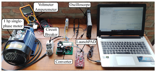 The implemented converter, with a volume-to-power ratio of 660 mm/W, was used for the experimental tests shown in Figure 12. The test setup includes a 1 hp, 127 Vac, 2-pole single-phase induction machine manufactured by Eletroplas, a hydraulic pump, a LaunchPad from Texas Instruments with a TMS320F28379D processor, a multimeter for current and voltage measurement, a personal computer with Code Composer Studio, and an oscilloscope Hantek, model 6022bl.