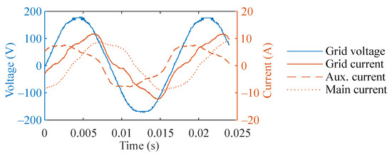 Initially, the motor was directly connected to the grid using its auxiliary capacitor, which drove the hydraulic pump coupled to its shaft. The steady-state grid voltage and current, as well as the auxiliary and main winding currents, are plotted in Figure 13. It was observed that the current distortion, caused by magnetic saturation, resulted in a significant THD in both the motor and grid currents. Table 2 presents the third, fifth, and seventh harmonic orders relative to the fundamental, as well as the calculated total THD.