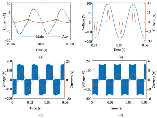 Current and voltage signals from converter driving the single-phase motor with a 5 kHz switching frequency. (a) Main and auxilary currents, no load. (b) Grid voltage and current, full pump load. (c) Main voltage and current, full pump load. (d) Aux. voltage and current, full pump load.