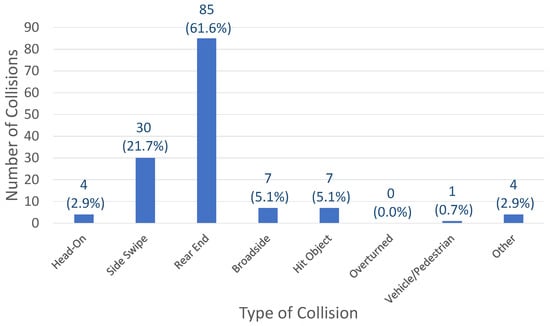 Since these reports are individually filed by each manufacturer, an analysis needs to be conducted to understand the trends. Based on the analysis conducted by [] on the data between 2014 and 2019, it was realized that the most challenging situation for AVs occurred when there were changes in the road surface conditions. For instance, when the road is wet, AVs are more vulnerable to accidents. The study used the Pearson chi-square test for calculating the relation between various elements and considered both manual override and autonomous modes. Although the authors did discuss hit-and-run cases, there was no mention of how AVs respond to such situations. The study also demonstrated that none of the AVs struck any stationary vehicle or object, regardless of the weather and road conditions. Although this is remarkable, it is also expected due to the extensive research being conducted on AV perception tasks as well as improvements in perception data acquisition technologies (camera, LiDAR, etc.). Moreover, 38% of the accidents occurred when AVs were in manual mode since the driver often disengaged the autonomous mode during erratic situations. It should also be noted that [] found that 62% of the collisions were rear-ended, implying that the following vehicle was at fault. A chart showing the types of collisions and their percentages for the years 2014–2019 is indicated in Figure 1. A more recent study [] suggests that these rear-ended crashes are likely due to the conservative behavior of AVs. An analysis combining the collision and disengagement statistics will provide further insight into the performance of AVs and their shortcomings.