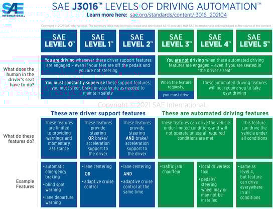 Levels of driving automation as defined by SAE J3016 (2021). Figure courtesy of []. Copyright ©2021, SAE International.