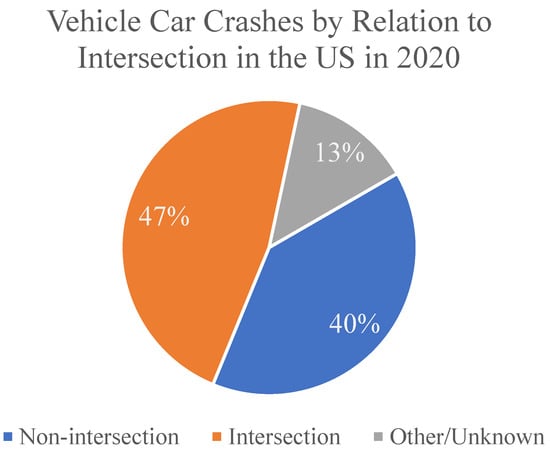 Based on an analysis of currently deployed AVs in California [,] and the 2020 traffic safety fact report by the NHTSA [], a list of the five most common edge cases with respect to their occurrences and fatalities was compiled. Based on [,], it was found that current AVs struggled the most with changes in road conditions, which was closely associated with adverse weather conditions (Section 2). Additionally, it was found that 38% of the accidents occurred during emergencies when the driver had to enable manual override which was labeled as near-accident scenarios (Section 6). Using the traffic accident statistics for 2020 [], it was found that intersections (Section 3), pedestrian crosswalks (Section 4), and roundabouts (Section 5) were the ones where human drivers faced the most difficulties. A chart summarizing the accidents occurring at intersections can be seen in Figure 3.