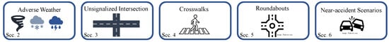 This review paper lists these scenarios and discusses the various planning and control techniques used to tackle the issues presented, along with their shortcomings. Hence, as compared to other surveys which are mostly divided based on the navigation algorithm used (e.g., reinforcement learning, model predictive control, etc.) [,,,], this paper is more concerned with the situations that these algorithms can handle. Rather than focusing on the methodology or the type of algorithm used, this article provides a more comprehensive approach to deal with the considered scenarios and identifies overall shortcomings that should be addressed for each scenario. In addition, the scenarios are selected based on an analysis of the current AV shortcomings based on those deployed in California [,], as well as the latest traffic accident statistics obtained from the NHTSA []. Additionally, this survey paper is organized in a way such that it is readable by researchers from other fields or those relatively new to the AV area. Moreover, this paper mostly uses studies conducted after 2018 and is therefore representative of the latest trends in each scenario.
