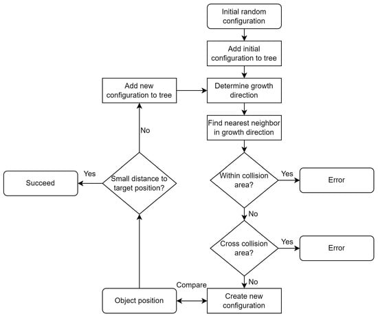 Graph-based methods such as A* search [], Dijkstra, and other search algorithms are commonly used in mobile robotics for path planning purposes []. Since dynamic path planning is required in the case of intersections, the rapidly exploring random tree (RRT) algorithm [] is commonly used. RRT is a sampling-based method that can find a possible path within a comparatively short amount of time and react to changes in the environment. The tree expansion phase and the path construction step are two fundamental components of the RRT method. The algorithm generates an initial random configuration and attempts to link it to the current tree during the tree expansion stage. The distance measure is used to first locate the node in the tree that is closest to the new configuration which is then used to generate a new configuration. If the new arrangement avoids collisions, it is linked to the closest node and inserted as a new node to the tree. During the path construction step, the algorithm attempts to find a path from the start configuration to the goal configuration. Starting with the goal configuration, the algorithm locates the node in the tree that is closest to the goal. It then moves upwards, being terminated when the start configuration is reached. This algorithm is shown in Figure 6.