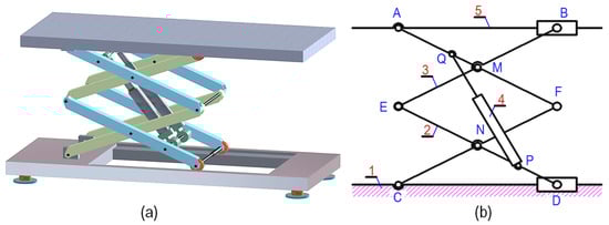 Depending on the required capacity, scissor lifts can come in various sizes and configurations, from portable platforms that can be easily moved around to large industrial ones that can reach 15 m [] or a lifting load of up to 1.0 tons []. Many studies have been conducted on scissor lifts to analyze the operation of the systems. From constructed 3D model and the FEA simulation, İzzet et al. [] innovated and successfully manufactured a single-stage scissor lift with a capacity of up to 25 tons. With the use of a frequency inverter for hydrostatic systems, the platform can operate fluently without sudden transitions, which ensures the ramped operation of the motor and improves the safety of the device. Soma Raghavendra et al. [] and Tian Hongyu [] proposed the calculation and design of a scissor lift by using Pro/E and analysis in Ansys. Using finite element analysis for improving the stability of the scissor lifting platform is investigated in [,]. In these researches, Abaqus and Autodesk Fusion software are used to analyze the deformation of worktable. By constructing a 3D model of a double-stage structure in SolidWorks and employing finite element analysis, Karagülle et al. [] presented the determination of internal loads on each component and evaluate the system’s rigidity and dynamic stability. Spackman [] applied mathematical techniques to analyze the mechanism of n-layer scissor lifts. This study not only analyzed the reactions in the scissor members but also presented some design issues related to actuator placement, member strength, and rigidity. Kirsanov [] derived a precise and relatively simple general formula set to calculate the deflection of a flat cantilever using an n-stage scissor mechanism. By considering the shape of the cross-section and the material of the structure arm for accurate design, the proposed equation enables the calculation of both longitudinal and flexural deformation of the mechanism.