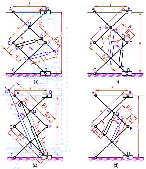 Through analyzing the structures as shown in Figure 2, the authors found that when changing the position of the mounting joints P and Q of the cylinders on parallel arms, there are two situations related to the operation of the system, including (a) (platform lower when cylinder extends, Figure 2a) and (b) (platform raises when cylinder extends, Figure 2b–d). The calculation process for these cases can be processed with the following steps.