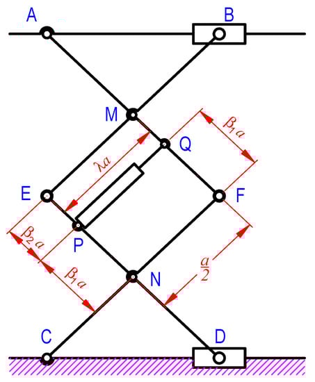 It should be noted that, for the case , the structure becomes as shown in Figure 4. Due to the construction of the device, opposite arms move in parallel direction. For this, NP is always parallel with FQ; therefore, . This is contradictory because PQ is the cylinder of which the length is varied. The operation of cylinders (extending or retracting) in this case will have resulted in damaged arms and even broken the whole devices. For this reason, this configuration must be avoided in design and manufacturing.