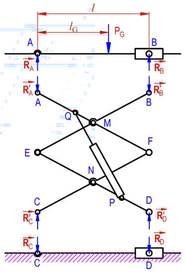 To be more specific for the calculation process, some parameters are added, including the load of the arms W, the distance lG between G and fixed support A (lG can be negative if G is on the left of point A, and lG > l if the platform is raised too high that support B moves to the left side of G, see Figure 5). Assuming the platform is raised slowly so that the effect of inertia forces in the system can be neglected, and considering no resistance in the joints’ motion, which disregards the influence of friction, the calculation procedure can be carried out with static analysis.