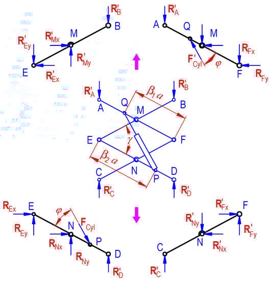Replacing the cylinder with thrust force FCyl and releasing the connection at joints, i.e., M, N, E, and F into directional component reactions in the x- and y-axis, the free-body diagram in each arm of the mechanism is presented in Figure 6.
