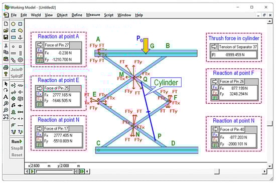 To verify the accuracy of the calculation method, 2D physical models were constructed in Working Model software for comparing reactions at joints. The cylinder was replaced with a separator element whose length can be adjusted to verify the platform’s height. By assigning external force PG = 5000 N and arms’ weight W = 75 N (corresponding to features from industrial devices, solid steel bars of 20 × 40 mm), loading on every joint and thrush force of the cylinder can be acquired from the physical model using the “Measure” option as presented in Figure 7. By changing the orientation of cylinders and cylinder’s length in the model, the reactions are measured and stored for comparing with those obtained by the proposed method, as summarized in Table 1.