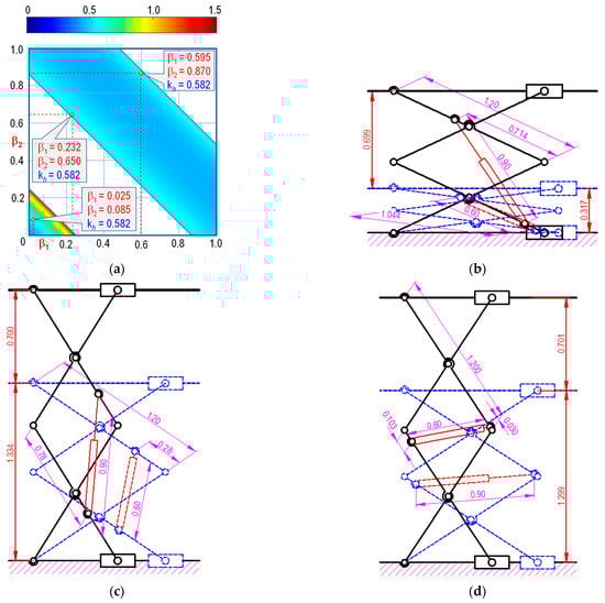 Configurations of the scissor lifts from the given data set (lCyl max, lCyl min): (a) lifting ratio kh; and three configurations using the graph data representing (b) , (c) , and (d) (Unit: m).