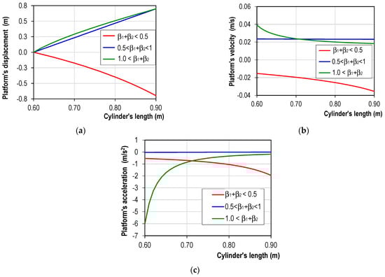 Kinematic of the platform in three cases from Figure 8 during the operation of the cylinder: (a) displacement, (b) velocity, and (c) acceleration.
