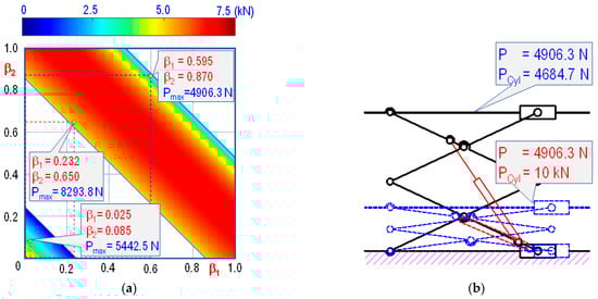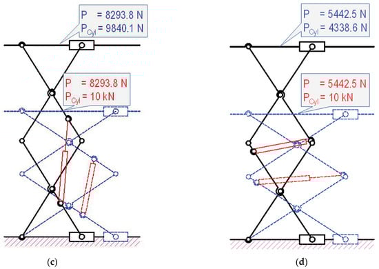 Since the requirement of thrush force reduces when lifting an object from the lowest to the highest positions, the maximum load Pmax is calculated based on hmin, or minimum length of cylinders () for and maximum lengths () for . Figure 10 presents the varying maximum load according to the different orientations of and by using the given cylinders. Three configurations in Figure 8 were chosen to verify the calculation result, as shown in Figure 10. To further investigate the effect of these loads on the operation of the cylinder, the highest and lowest positions of the structures are included in the analysis (see Figure 10b–d).