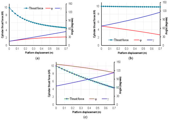 The results from Figure 10 also indicate that even though the initial load is constant, the required thrust force for raising the platform to higher positions of the cylinder is significantly reduced (up to 57% in the first configuration and 52% in the third, but about 0.2% in the second configuration). A possible explanation for this feature is that when the platform is raised, the angle γ between arms, and the angle φ between cylinder and arm varies, which changes reactions from axial directions into tangential directions and increases the impact of the thrust force on the bending moment of arms. Not to mention that although three structures share the same platform’s displacement (0.7 m), the difference of γ also influences the magnitude of the reaction in cylinders. Figure 11 presents the change of minimum thrust force corresponding to the maximum load and angles γ and φ in each configuration.