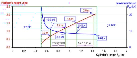 From the diagram in Figure 12, if the platform is required to be raised 0.5 m, we can either select cylinders with a 0.67-m initial length and 0.26-m stroke (corresponding to hmin = 0.7 and hmax = 1.2 m) with a maximum load of 10.8 kN or select other ones with a 1.10-m initial length and 0.30-m stroke (hmin = 1.5 and hmax = 2.0 m) with a maximum loading of 8.4 kN (has longer stroke but require smaller thrust force).