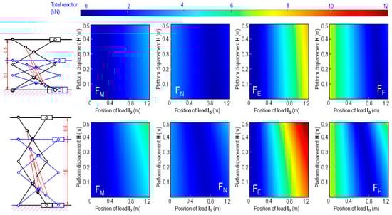 In addition, for selecting the appropriate cylinders, the acquired expressions also allow the determination of limited load for designing connecting joints. For more detailed analysis, the two types of selected cylinders are used to inspect the change in reaction at other revolution joints, i.e., M, N, E, and F. Assuming the platform width is 1.2 m (equal to the length of one arm) to allow lifting object moving along the platform (0 < lG < 1.2) during the operation of the system, Figure 13 presents the change of reaction at joints for the selected scissor lifts. It can be observed that while the first configuration requires higher cylinder thrust force, reaction at joints in this case is much smaller (only 4.7 kN, comparing with the maximum reaction in the second configuration, i.e., 13 kN). Moreover, since the first configuration has lower initial height, the change of distance l between support A and B and platform’s height is also smaller than the second one, which makes more stable for this structure.