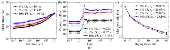 The (a) yield stress, (b) thixotropic response time, and (c) dry-out properties of SMP inks with different FS concentrations.