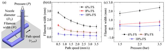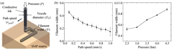where Q is the volume flow rate, De is the filament diameter equivalent to filament width, and vpath is the path speed. Based on this equation, the increase in path speed results in a decrease in filament width. In addition, as presented in Figure 3b, the increase of FS led to a decrease in filament width. As shown in Figure 2a, the higher FS concentration indicated the higher viscosity of the SMP ink. When a constant dispensing pressure was applied, less ink material can be extruded in higher viscosity inks, causing the extrusion of smaller filaments. The effects of dispensing pressure on the filament width are illustrated in Figure 3c. As the pressure increased from 1.5 to 3.5 bar, the filament width increased. In addition, the SMP ink with the lowest FS concentration of 6% was most sensitive to the changing pressure. It had a lower viscosity, as depicted in Figure 2a, which resulted in larger filament widths. The dispensing pressure directly determined the volume of ink material being extruded out of the nozzle. In particular, it is given by [49]: