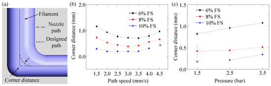 The corner distance, measured as the deviation between the designed path (marked by a dashed line) and the printed filament (marked by a center, dash-dot, line), is illustrated in Figure 4a. When the path speed increased from 1.5 to 4.5 mm/s, the corner distance presented a positive parabolic trend, as shown in Figure 4b. This was due to the filament being over-deposited at a low path speed and being stretched at a high path speed. With the pressure remaining constant, a low path speed created an excessive buildup of the filament, causing an unstable pattern. The relationship described by Equation (2) implies that an increase in path speed leads to the filament stretching, resulting in a reduced filament width and a deviation from the designed path. For the SMP ink with 10% FS, a filament could not be formed at a path speed of 4.5 mm/s nor pressure of 1.5 bar due to the high viscosity. The effects of dispensing pressure on the corner distance are illustrated in Figure 4c. When the pressure increased from 1.5 to 3.5 bar, the corner distance increased. In addition, as the FS concentration increased, the corner distance decreased. This was attributed to a lower FS concentration, resulting in a lower viscosity SMP ink and greatly affecting the filament geometry upon extrusion (Equation (3)).