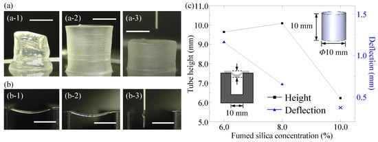 To demonstrate the self-supporting capability of the SMP inks, vertical tubes with a diameter of 10 mm and a height of 10 mm were printed using a 25-G dispensing nozzle at a path speed of 1.5 mm/s and a dispensing pressure of 2.5 bar. Following the printing process, images of each tube were captured using a digital camera (DC-FZ80, Panasonic, Osaka, Japan). These images were then analyzed using the software ImageJ (available at https://imagej.nih.gov/ij/, accessed on 2 March 2022) to obtain precise measurements of the actual diameter and height of the tubes. To investigate the deflection when printing spanning features, a custom-made supporting tool fabricated in the lab featured gap distances of 0.5, 1.0, 2.0, 4.0, 6.0, 8.0, and 10.0 mm [28]. Filament beams composed of SMP inks with different FS concentrations were extruded through the 25-G dispensing nozzle and deposited onto the supporting tool. The same printing parameters as the tube printing were used. The digital camera was used to capture images of the filament beam deflections at the largest gap distance of 10.0 mm and the deflections were measured using ImageJ 1.53n 7.