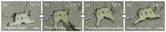 (a) Smart hinge in its original shape at 24 °C; (b) Programming at 130 °C; (c) Folded hinge after post-programming at 24 °C; (d) Shape recovery of the smart hinge at 130 °C. All scale bars: 5.00 mm.