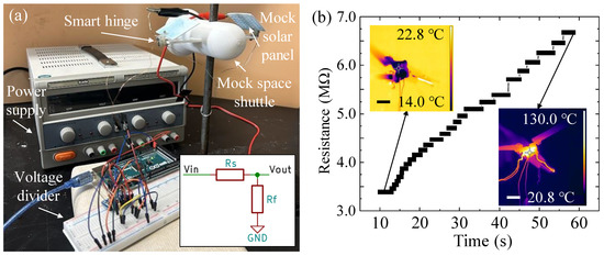 (a) Application testing setup (inset: schematic of the voltage divider circuit); (b) Variable resistance as a function of time during the deployment of mock solar panels from the mock space shuttle (insets: temperature distribution of one of the smart hinges during deployment. Scale bars: 10.00 mm).