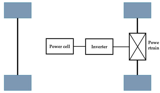 Figure 1 is the architecture of the electric vehicle used in this study. It consists of the tires, the power cell, the inverter, and the powertrain. The powertrain includes the driving motor, the fixed-speed ratio reducer, and the differential. The mechanical differential is used, and the turning process is similar to that in a conventional car. This means the control is relatively simple. The integration is improved, and the cost is reduced.