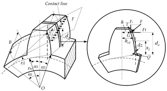 In the previous energy method, the energy caused by contact deformation, bending deflection, shear deflection, and radial compression deflection was included. Radial compression deflection refers to the compression deformation caused by the radial force. The cantilever beam started from the base circle in the literature [], but the cantilever started at the gear root in the literature []. Two cases appear where the radius of the root circle is larger than the radius of the base circle, and the radius of the root circle is smaller than the radius of the base circle. Considering these two cases, the cantilever starts at the tooth root in this paper.