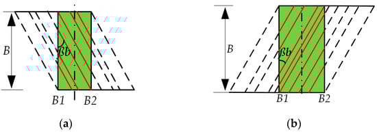 where kbp, ksp, krcp, kabp, kasp and kfp are the bending stiffness, the shear stiffness, the radial compression stiffness, the axial bending stiffness, the axial shearing stiffness, and the fillet-foundation stiffness of the positive gear. Accordingly, the kbg, ksg, krcg, kabg, kasg, and kfg represent the bending stiffness, the shear stiffness, the radial compression stiffness, the axial bending stiffness, the axial shearing stiffness, and the fillet-foundation stiffness of the negative gear. The kh is the Herz contact stiffness. These stiffness components are obtained by integrating the stiffness of each slice, and the integration is done according to the parameters of the gears. The parameters of gears are shown in Table 1 and Table 2. Moreover, the kfpi and kfgi are obtained by the formulas in the literature [], and the parameters used in the formulas are also referred to in the literature []. For the helical gear pairs with a large helix angle, there are several pairs of gears meshing simultaneously. Figure 4 is the schematic diagram of the contact line length during the meshing progress. Figure 4a shows the variation of the contact line during the working progress of gear pair 1. Figure 4b shows gear pair 2.