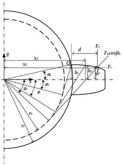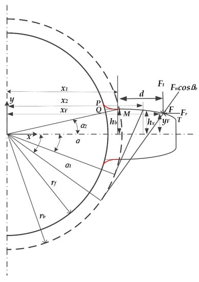where represents the abscissa of the intersection point; is the abscissa of the intersection point of the tooth root and the profile; is the abscissa of the intersection point of the base circle and the involute, is the abscissa of the intersection point when the force is at QM; is the abscissa of the intersection point when the force is at TM. represents the inertia at the position and is the inertia at position .