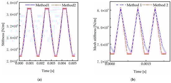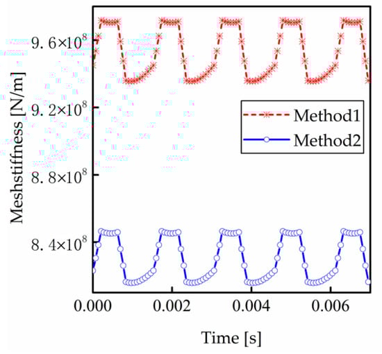 Figure 8 shows the stiffness of gear pair 1 in the electric vehicle calculated by two methods. The parameters of the first-stage gear used are shown in Table 2. Method 1 is the calculation result neglecting axial force in stiffness, and method 2 is stiffness considering the axial force component. The stiffness is 13% decreased after the axial force component is considered. This is because, under the same contact force, the deflection contains not only the deflections caused by transverse force but also the axial force, making the stiffness smaller.