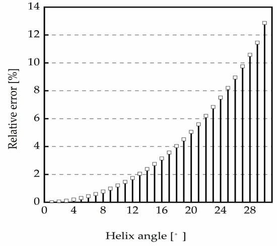 Figure 10 shows that the relative error gets bigger with the increase in the helix angle. When the helix angle is 20°, the relative error is more than 5%, and it is more than 10% when the helix angle is bigger than 27°. When the helix angle is up to 30.5°, the stiffness is 13% decreased. Thus, the axial force component in the mesh stiffness should be considered in the transmission system of electric vehicles.