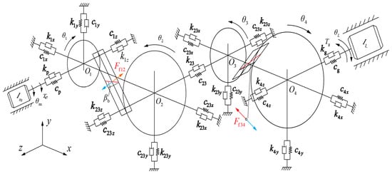 Figure 11 is the physical model of a two-stage driveline. A four-degree-of-freedom model is established for every gear (, , , and ). Two gears on the intermediate shaft are linked with an elastic shaft, and gears 2 and 3 are assumed to have the same vibration in the , , and directions. For the motor, one rotation freedom model is established, and for the load on the output shaft, the rotation freedom is established. Therefore a two-stage driveline model with 15 degrees of freedom is established.