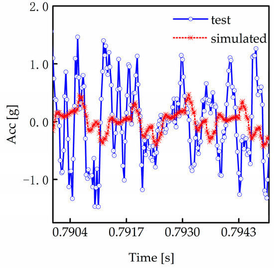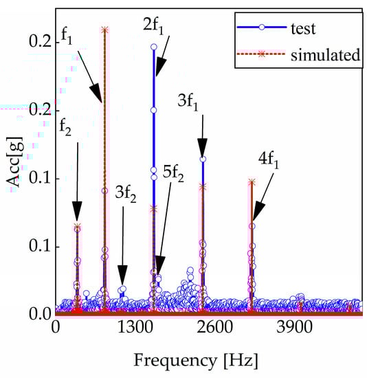 Figure 26 shows the vibration acceleration of gear 4 in the x direction in the time domain and the frequency domain. The acceleration increases mainly at the mesh frequency of second-stage gears, and the amplitude at the first stage follows. This is because the friction force and friction torque at the second stage are larger than that at the first stage, and the vibration of the driven gear at the second stage is mainly affected by the force between the stage-two gears. There is also a superimposed effect caused by the same frequency of the mesh frequency of the first gear and the triple mesh frequency of the second gear. This causes the vibration to accelerate at the frequency of f1 increase. Low-frequency components with small amplitudes appear. This is caused by friction during the mesh progress of engaging alternatively.