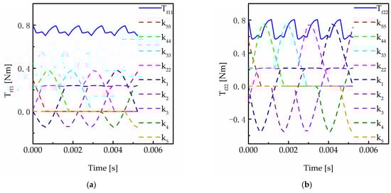 Figure 29a shows the dynamic meshing force of the second gear in the two-stage driveline with friction considered and neglected in the time domain. The calculated theoretical meshing force using Formula (56) is 3688 N, which is very close to the average of Fm34 3702 N. This indicates that the motor two-stage transmission system model established is correct [].