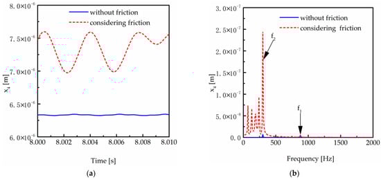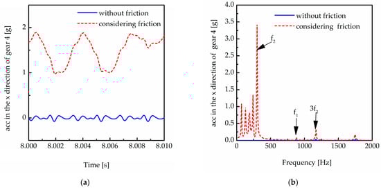 Gear 4’s vibration displacement in the x direction with friction considered or neglected. (a) In the time domain. (b) In the frequency domain.