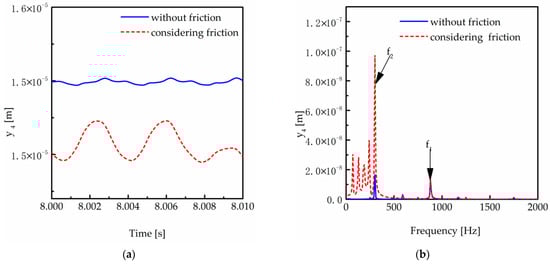 Vibration displacement of the follower gear at stage 2 in the y direction with friction considered or neglected. (a) In the time domain. (b) In the frequency domain.