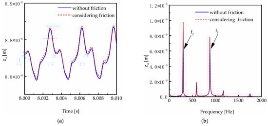 Figure 21 shows the vibration displacement of gear 4 in the z direction with friction considered and neglected in the time domain and the frequency domain. The amplitude barely increases, and the frequency components have no change. This is because there is no force component in the z direction. The only change in the vibration amplitude is caused by the coupling effect of the three directions.