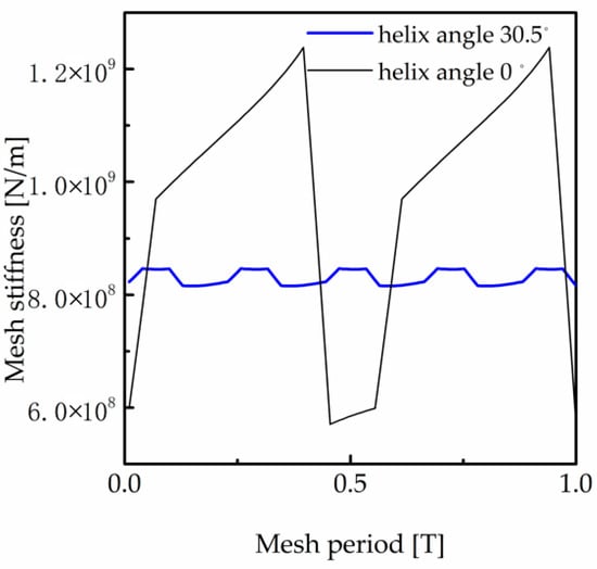 When employing the first-stage gear’s parameters, the relative stiffness error is more than 10% when the helix angle is bigger than 27°. When the helix angle is up to 30.5°, the relative stiffness error is more than 13%. The method can be used in transmission systems in electric vehicles with a large helix angle.