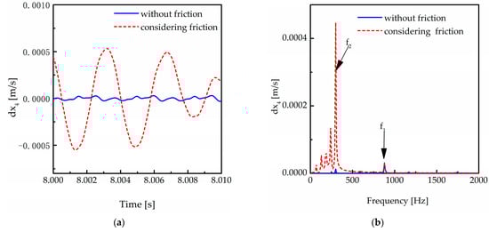 Vibration velocity of gear 4 in the x direction with friction considered or neglected. (a) In the time domain. (b) In the frequency domain.