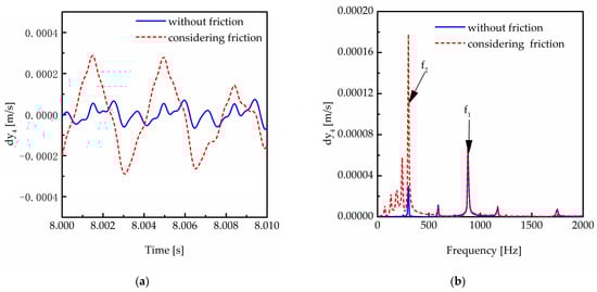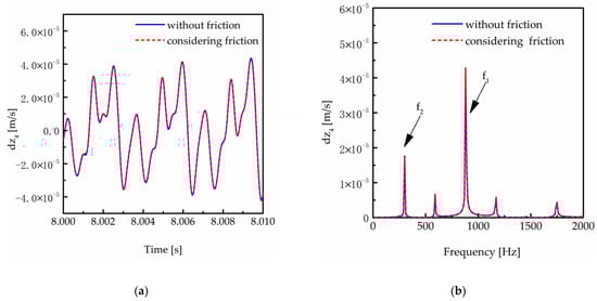 Figure 25 shows the vibration velocity in the z direction in the time domain and the frequency domain. The vibration velocity has almost no change after considering the friction. There is also no change in the frequency domain. This indicates that the coupling effect of the three directions is not obvious for the vibration velocity.