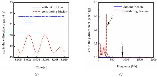 Figure 24 shows the vibration velocity in the y direction in the time domain and the frequency domain. With the friction considered, the vibration velocity in the y direction is slightly reduced. This is due to the inhibitory effect of friction, which is caused by the opposite direction of the meshing force. The amplitude of vibration velocity increases, especially at f2, the mesh frequency of the second-stage gears. This is caused by friction excitation, while it has nearly no change at the frequency f1. This is because gear 4 is mainly affected by the friction from gear pair 2. There are frequency components lower than the mesh frequency f2, which is caused by the alternating meshing process.