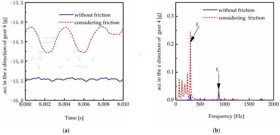 Figure 28a,b are the vibration acceleration of gear 4 in the z direction in the time domain and the frequency domain, respectively; the vibration acceleration increases. The amplitude at the mesh frequency of the second-stage gears increases. This is due to the coupling effect of the three directions. Lower-frequency components appear. This is because the coupling effect of the friction modulates the amplitude frequency of the vibration acceleration.