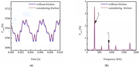 where T is the torque, d4 is the radius of gear 4’s indexing circle, is the helix angle, and is the normal pressure angle. Figure 28 shows that the meshing force has a very slight increase because of the friction. This is consistent with the result in the literature []. This can be explained by the dynamic Equations (48)–(50). Considering the friction action, a bigger meshing force is needed to realize the stress balance. Figure 28b reflects gear pair 2’s dynamic meshing force in the frequency domain. It is shown that the amplitude has nearly no increase, and the frequency components have no change. This indicates that the friction does not cause the meshing force to produce frequency modulation.