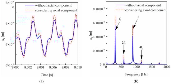 Figure 30a shows the vibration displacement of the driven gear of the second gear in the x direction over time. The vibration displacement amplitude increases after considering the axial force stiffness component. This is because, under the same meshing force, the deflection caused by the axial force component is also concluded, leading to a reduction in stiffness and an increase in the vibration. As shown in the frequency domain diagram Figure 30b, the vibration amplitude increases by 20% at the second gear pair’s mesh frequency. The vibration amplitude also increases at harmonics such as 2f2 and 4f2.