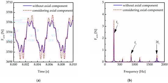 Figure 31 shows the dynamic meshing force variation of gears at the second stage, considering the axial force stiffness component in the time domain and the frequency domain. It is shown that the fluctuation of dynamic, engaging force increases when the axial force stiffness component is considered. It is illustrated in Figure 31b that the amplitude at the mesh frequency f2 increases by 21.8%. The amplitude at the harmonics also increases.