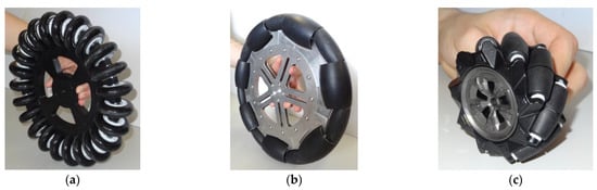 Figure 1 shows three omnidirectional wheels commonly used in mobile robots: (a) omni wheel, (b) optimal omni wheel, and (c) mecanum. The common characteristic of omnidirectional wheels is the use of free rollers placed on the external wheel perimeter. Rollers can rotate freely around their axis while the wheel turns around its axis, providing the wheel with two degrees of freedom; the first is the rotation around the wheel axis, and the second is the motion perpendicular to the roller axis. The omni wheel (Figure 1a) was invented in 1919 by Grabowiecki [16] and improved by Blumrich in 1972 [17]. Its free rollers are arranged with a characteristic 0° angular orientation of the free rolling direction relative to the wheel rotation axis. Figure 1b shows the optimal implementation of an omni wheel that combines rollers of different sizes in order to minimize the inner gap between rollers and minimize the generation of vibrations [18]. The mecanum wheel (Figure 1c), also known as the Swedish wheel [19], was invented in 1973 by Ilon [20]. Its free rollers are arranged with a characteristic 45° angular orientation of the free rolling direction relative to the wheel rotation axis [21].